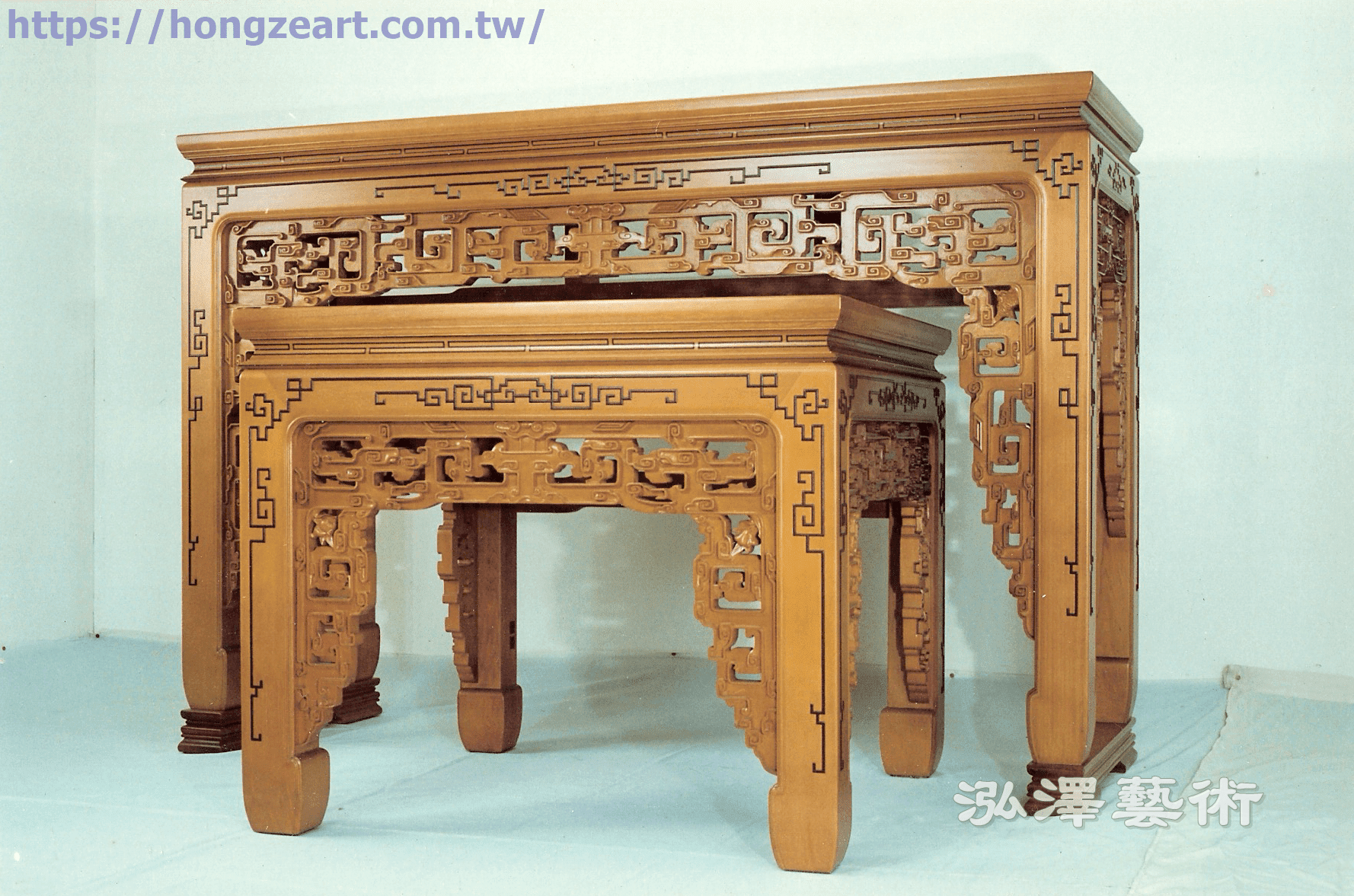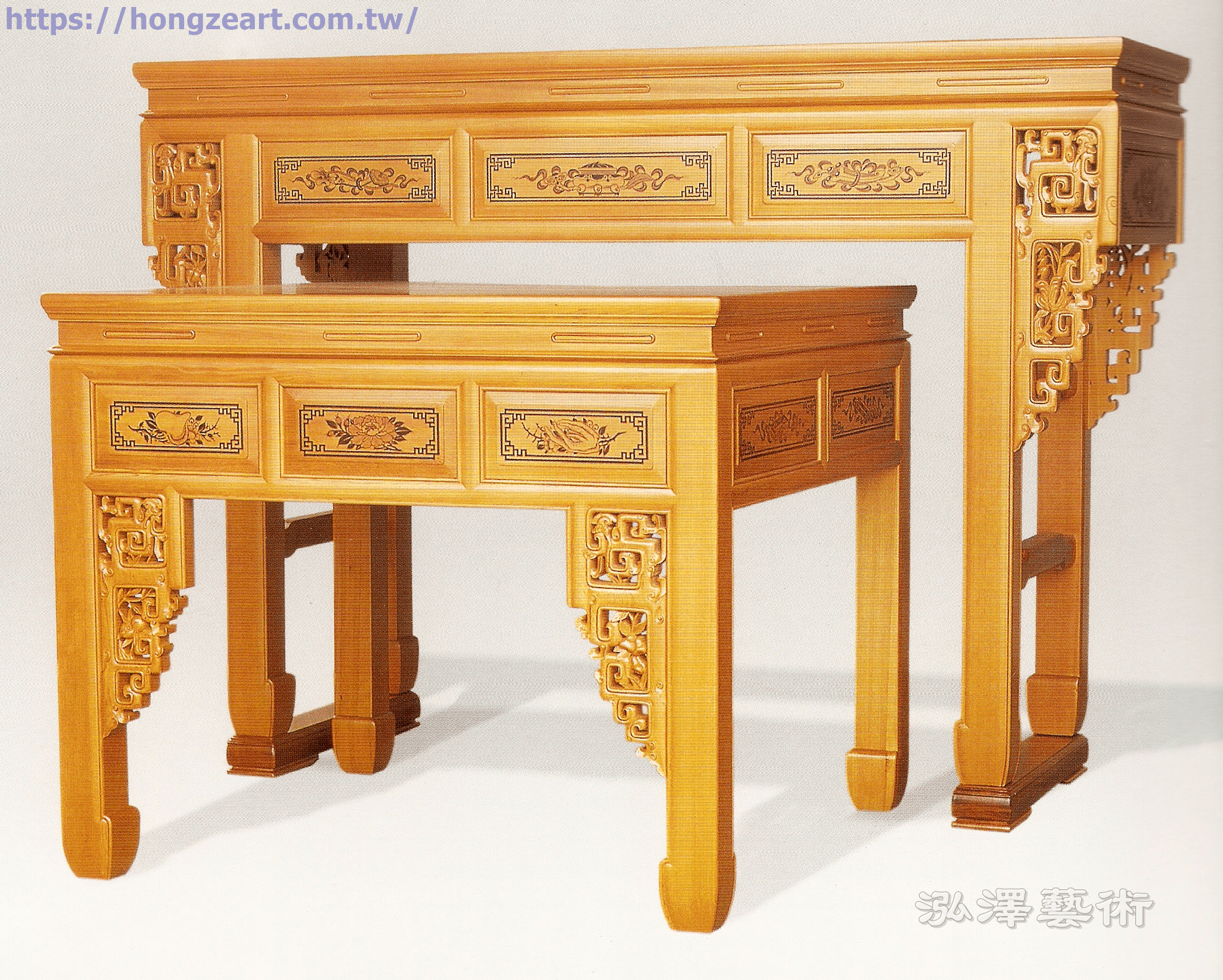 【簡述】 本作品兩件一組,為台灣早期常民生活所用之器具,陳設於祠堂或廳堂,上桌稱為「長案桌」,下桌稱為「八仙桌」。一般長案桌上正中央處置有神明龕,另一側則置有「公媽龕」(祖先龕),意為奉天祀地、敬神奉祖,敬神表示不妄為,奉祖則表示不忘本,含意深遠。