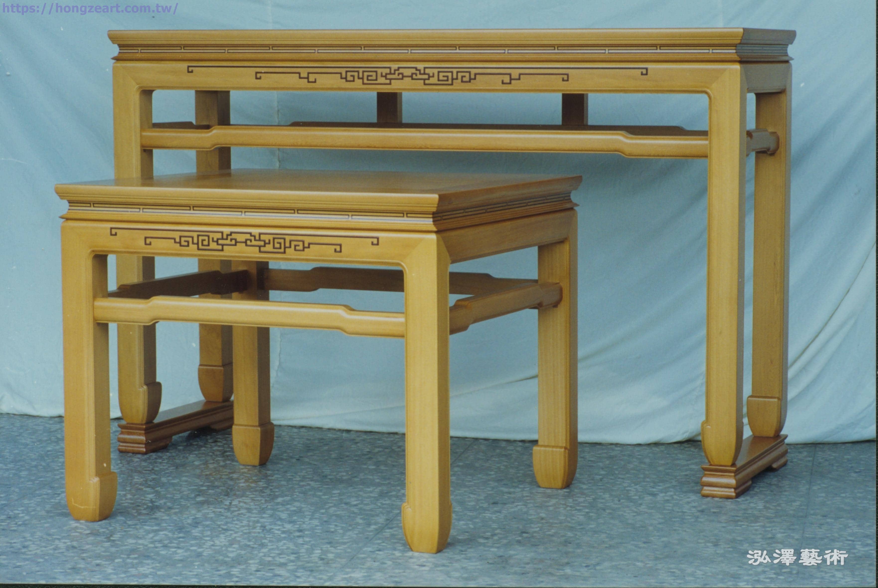 【簡述】 本作品以長案桌、八仙桌合為一組,稱為「漢式供桌」,為台灣早期常民生活所用之器具,陳設於祠堂或廳堂。在長案桌、八仙桌正面各鑲以茄苳木的「如意回紋」,代表如意綿延,整體造型簡潔大方。
