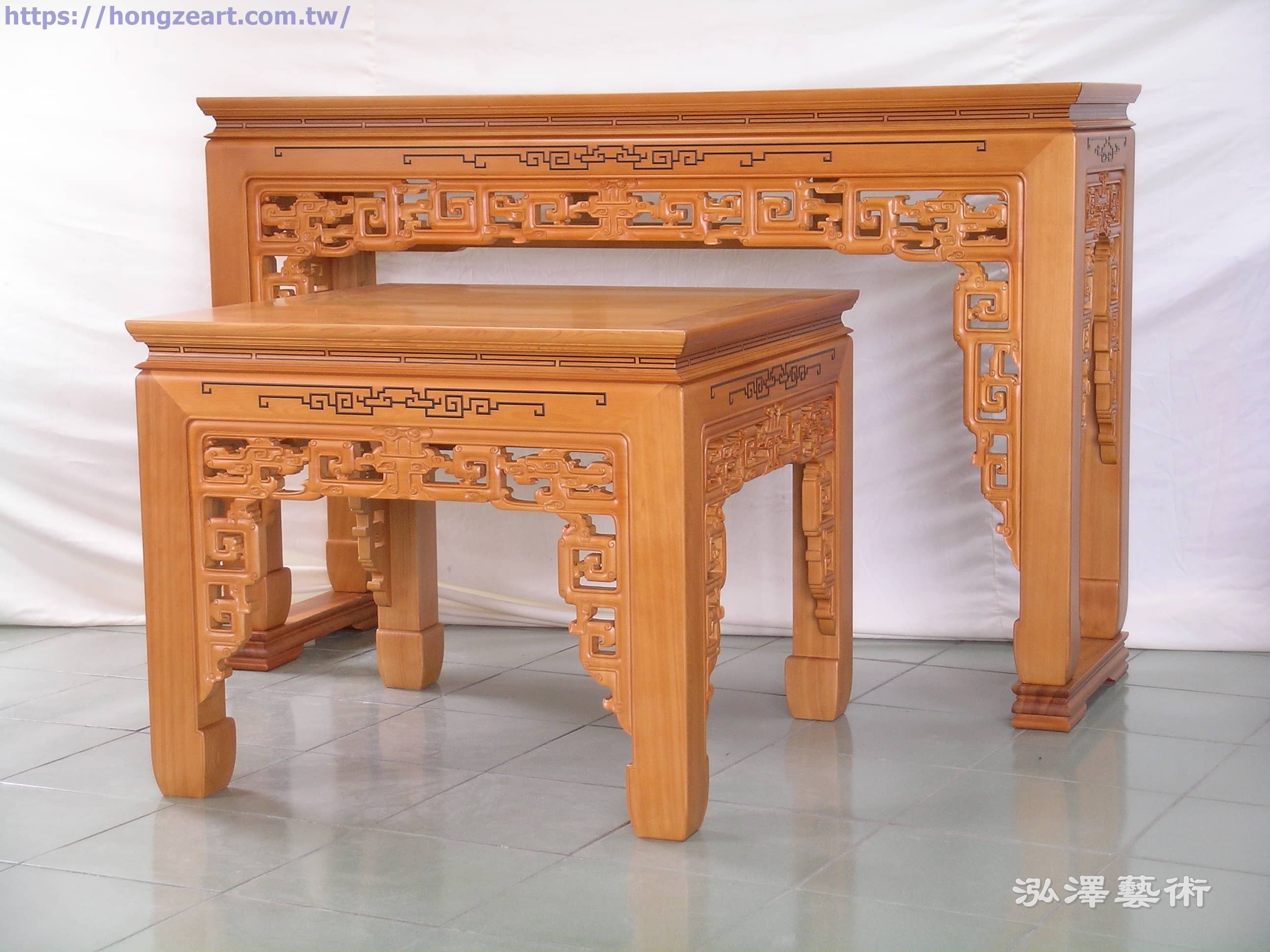 【簡述】 本作品兩件一組,陳設於祠堂或廳堂,雕以吉祥瓜果,如:佛手瓜、石榴、蟠桃、蓮霧等吉祥飾物。器面施以墨繪,典雅精緻。八仙桌兩側置有抽屜,可以放置祭拜用品,整體造型穩重又富人文氣息,為一雅緻作品。