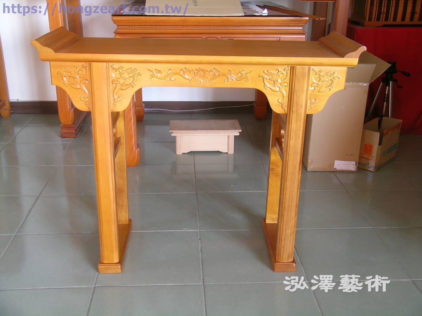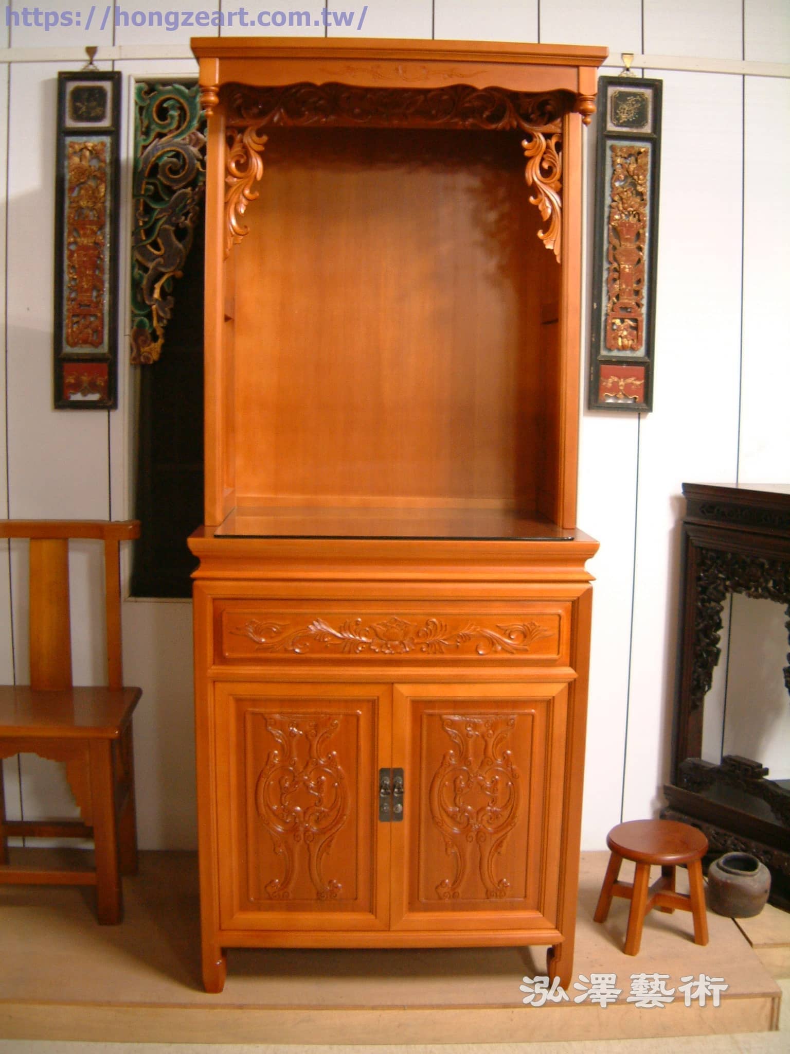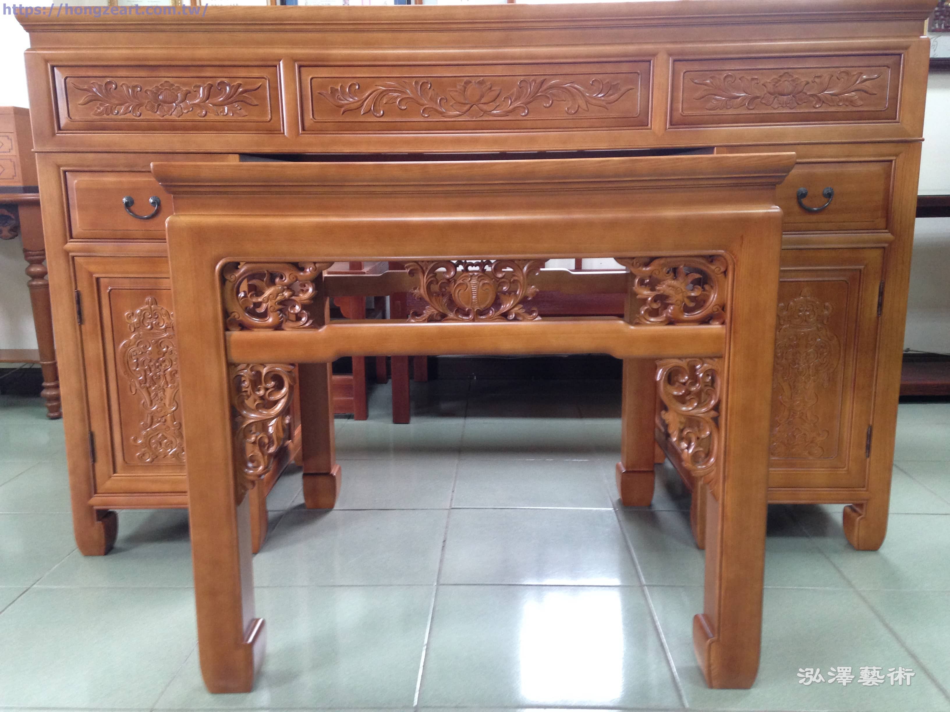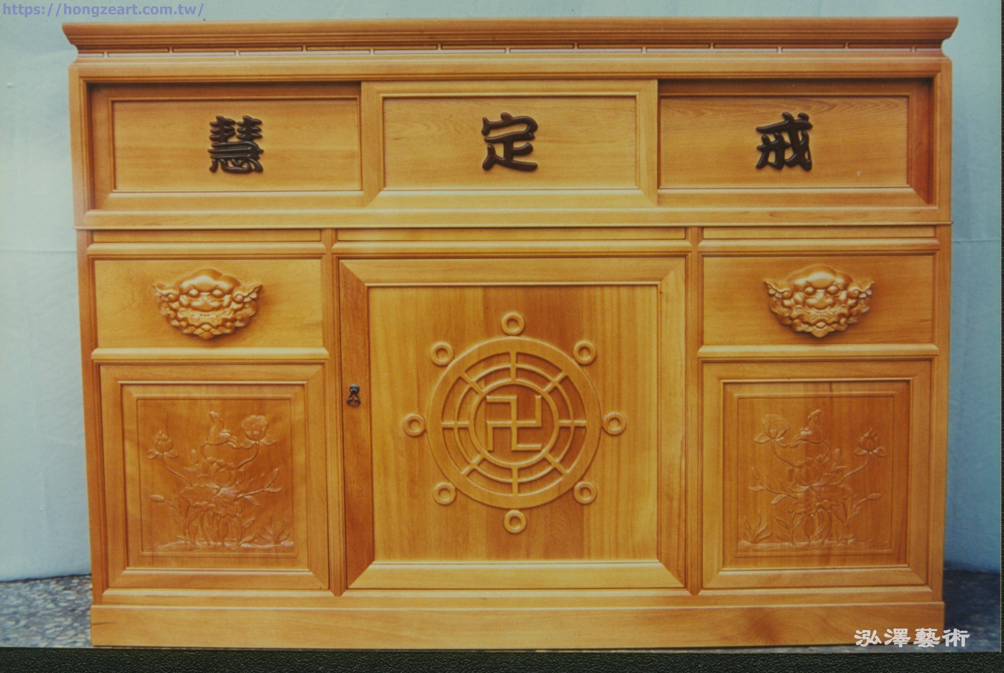 【簡述】 此作品雕刻牡丹、蓮花、花瓶,喻富貴平安吉祥,有抽屜、有拉門,可置放供佛物品,兼具收納功能,實用又典雅,置於佛堂,賞心悅目。