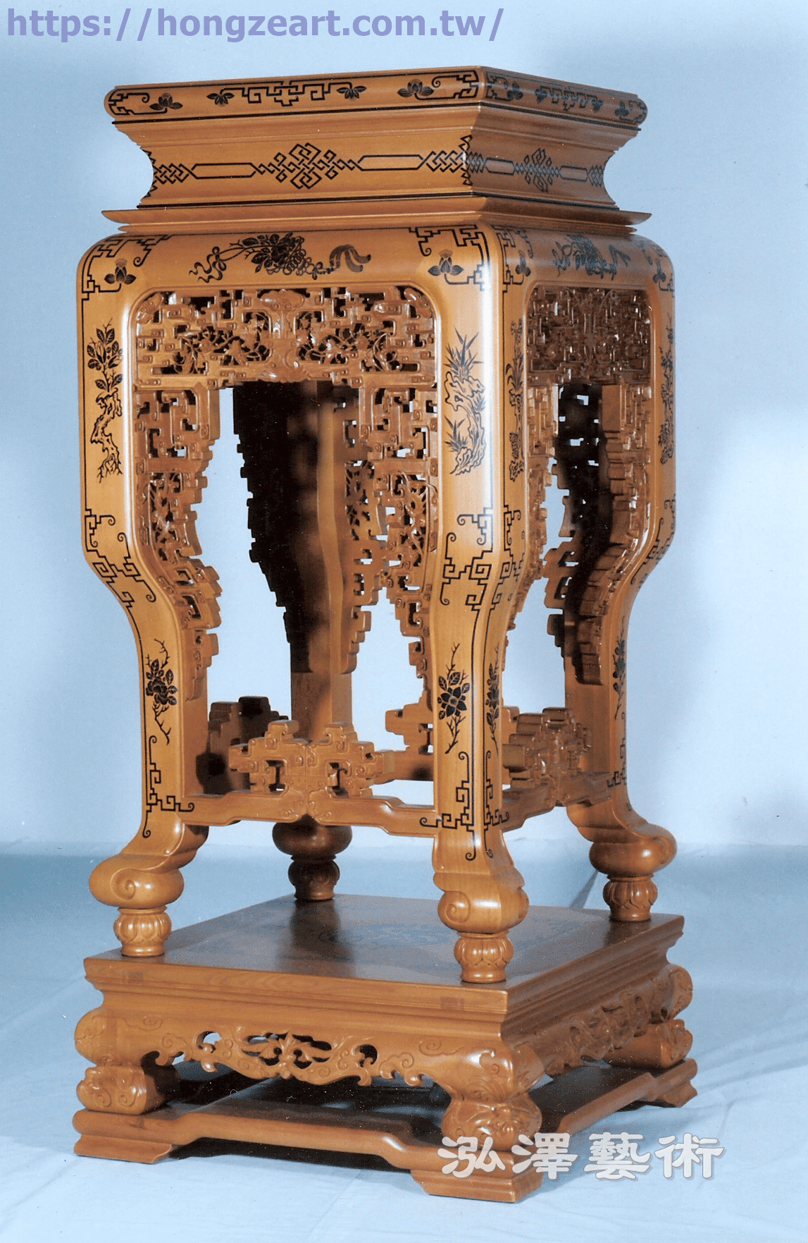 【簡述】 木作品係早期富貴人家中,陳設於傳統祠堂或廳堂中,置於「漢式供桌」兩側,稱為「花台」或「伴台」。桌面上可置大型花瓶,添上鮮花後,更添整體茂盛的氣勢,故又名「花瓶台」。