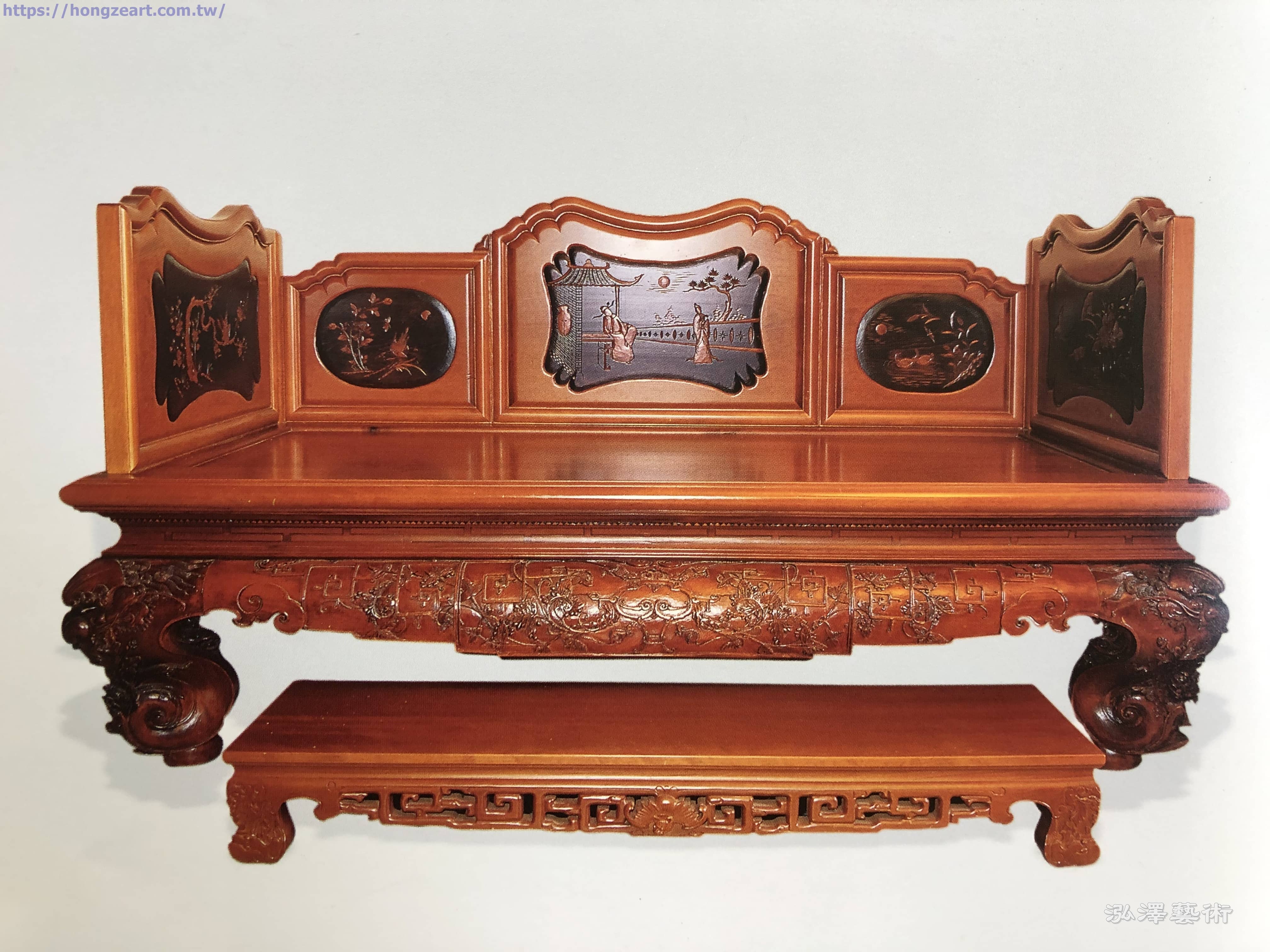 【簡述】 本作品為早期台灣常民生活中,形制較大之椅具,大都陳設於客廳或花廳之內,椅面上置有小奉茶几,前方放置刻有蝙蝠的「腳踏板」,意為「福在眼前」;賓客來訪或夫妻閑聊時,可坐於椅上,中置清茗糕點,或聊天、或培養感情,其樂也融融。