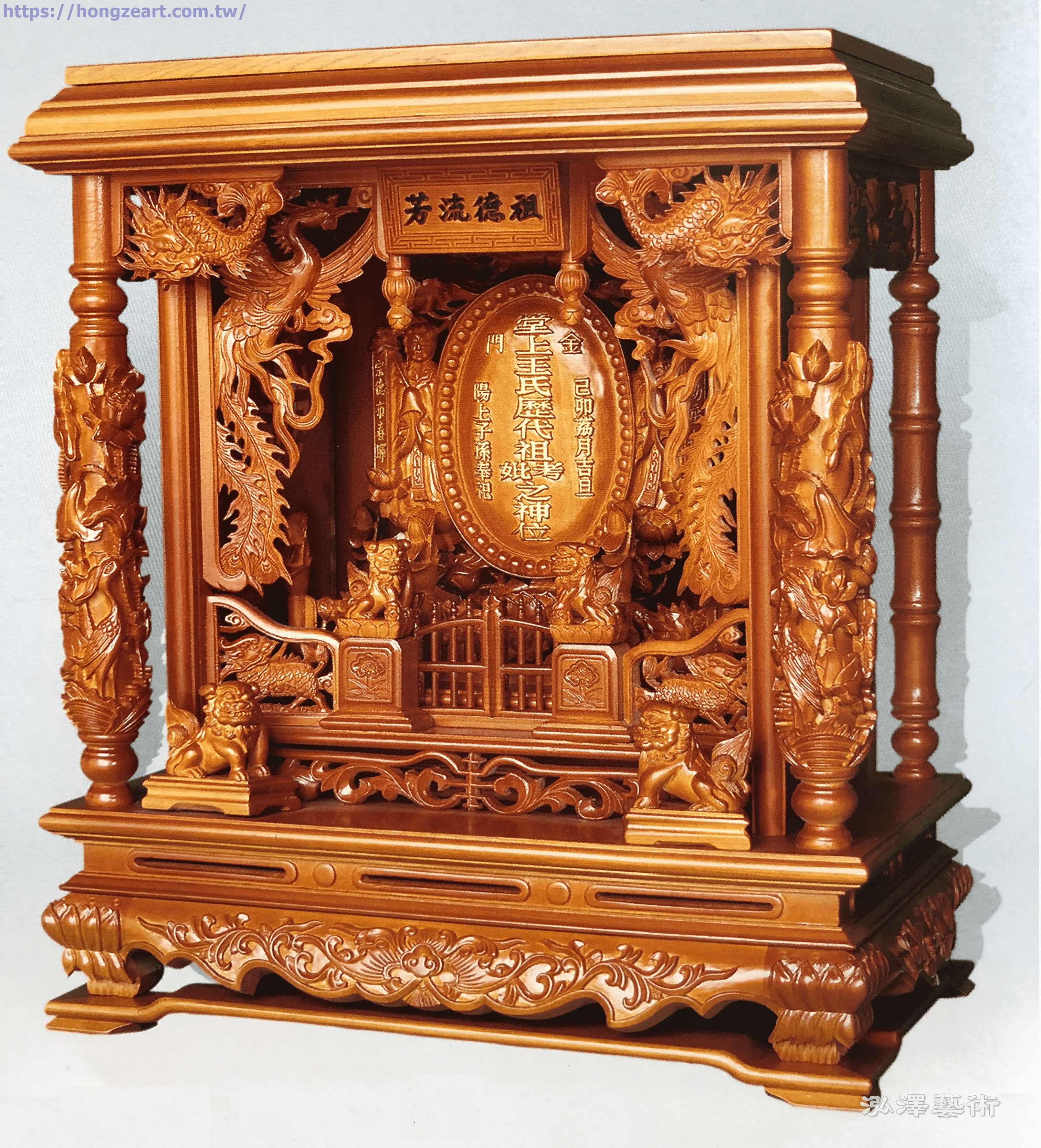 【簡述】 本龕乃是一座小家祠,匾額高揭「祖德流芳」,座台上蓮花、仙鶴混柱纏繞成支柱,象徴「一路連科」,意寓後世子孫金榜題名、平步青雲,以光耀門楣。頂板、背板可抽取,以便取出牌位內祖先世系登記木卡。以示一脈相承、萬世香火。