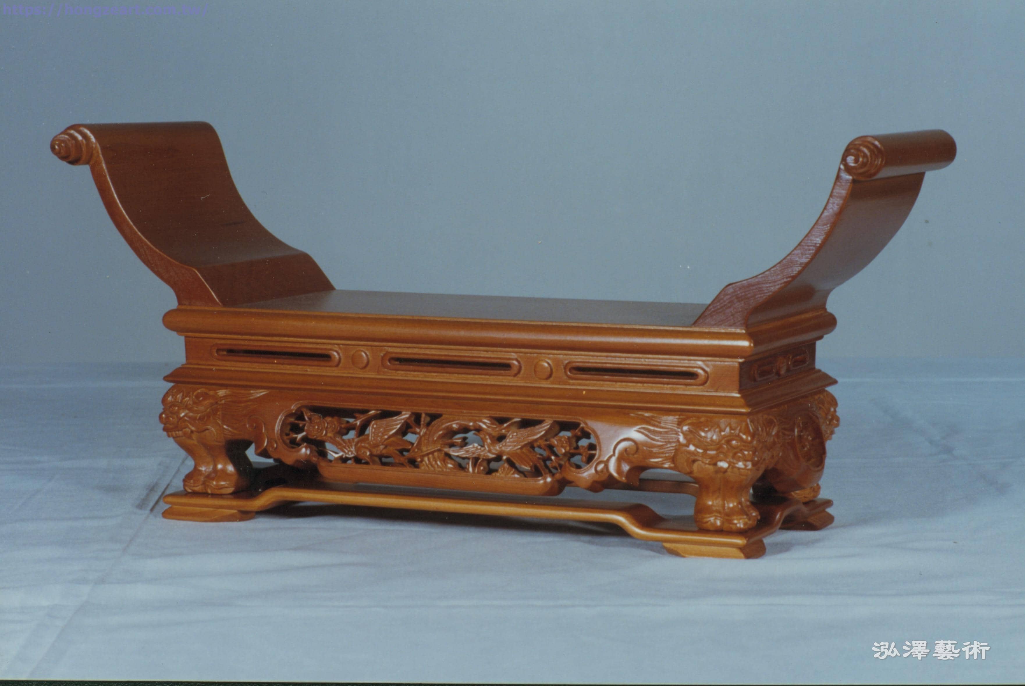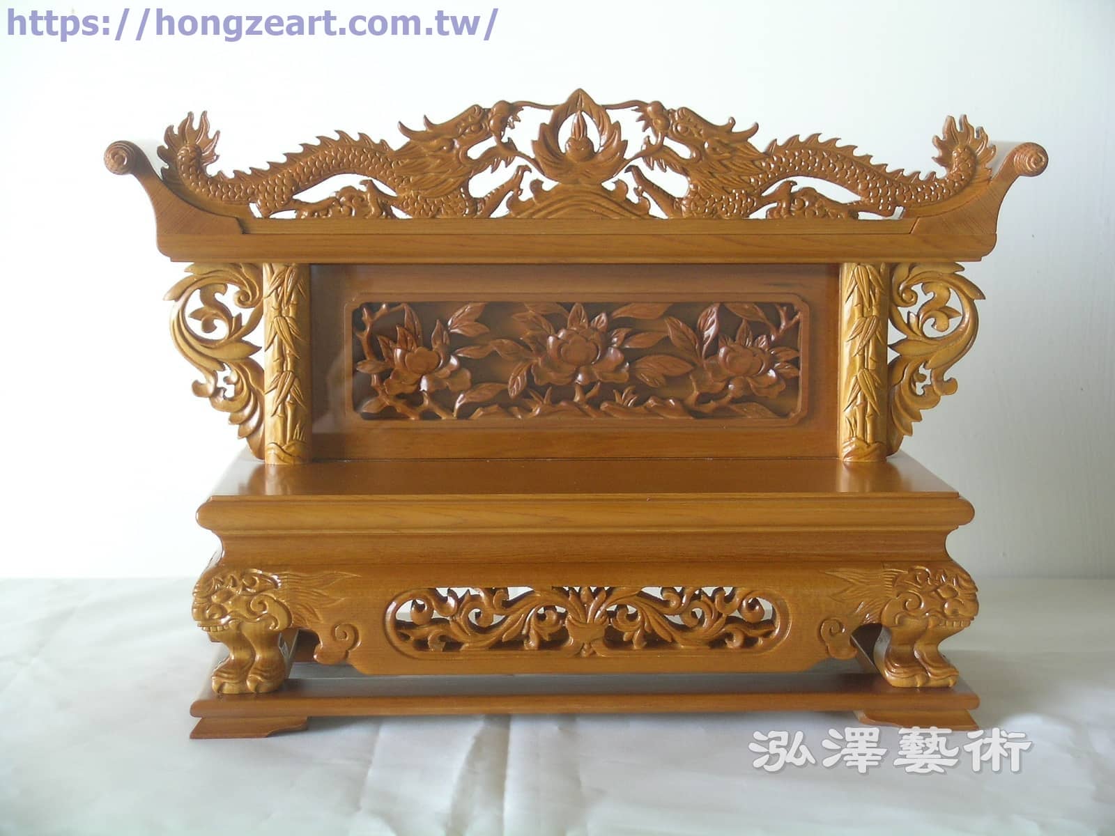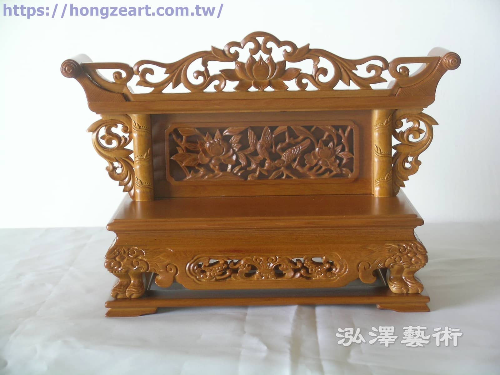 【簡述】 本台座勒水處以花鳥透雕,喜鵲棲息於梅花上,捎來喜訊,意喻「梅鵲報喜」。案面書卷形翹頭,期望子孫世世代代以書香傳家。本作品與一路連科祖先龕搭配成一體系,更添奉祀祖先之虔敬與莊嚴隆重氣氛。