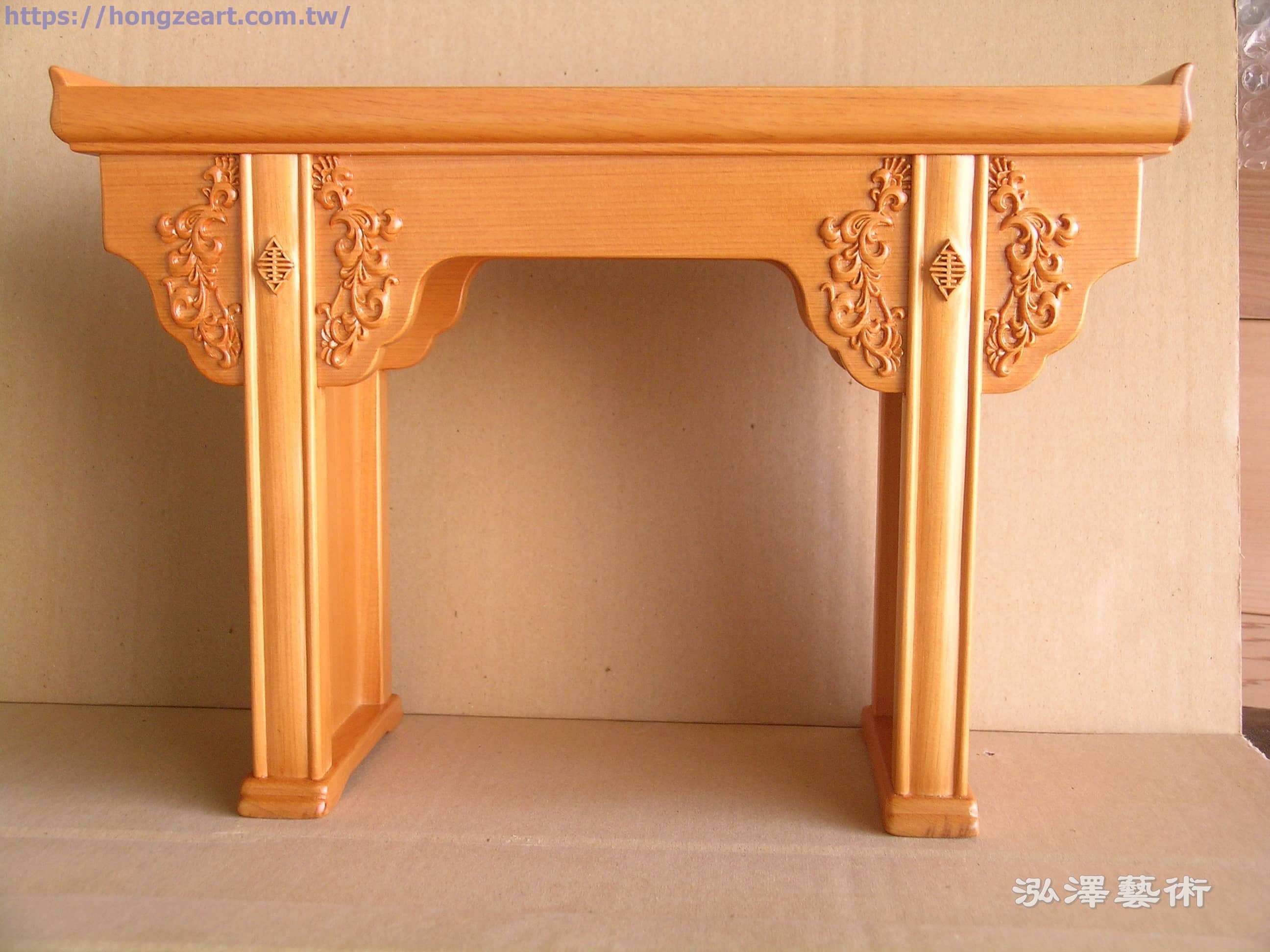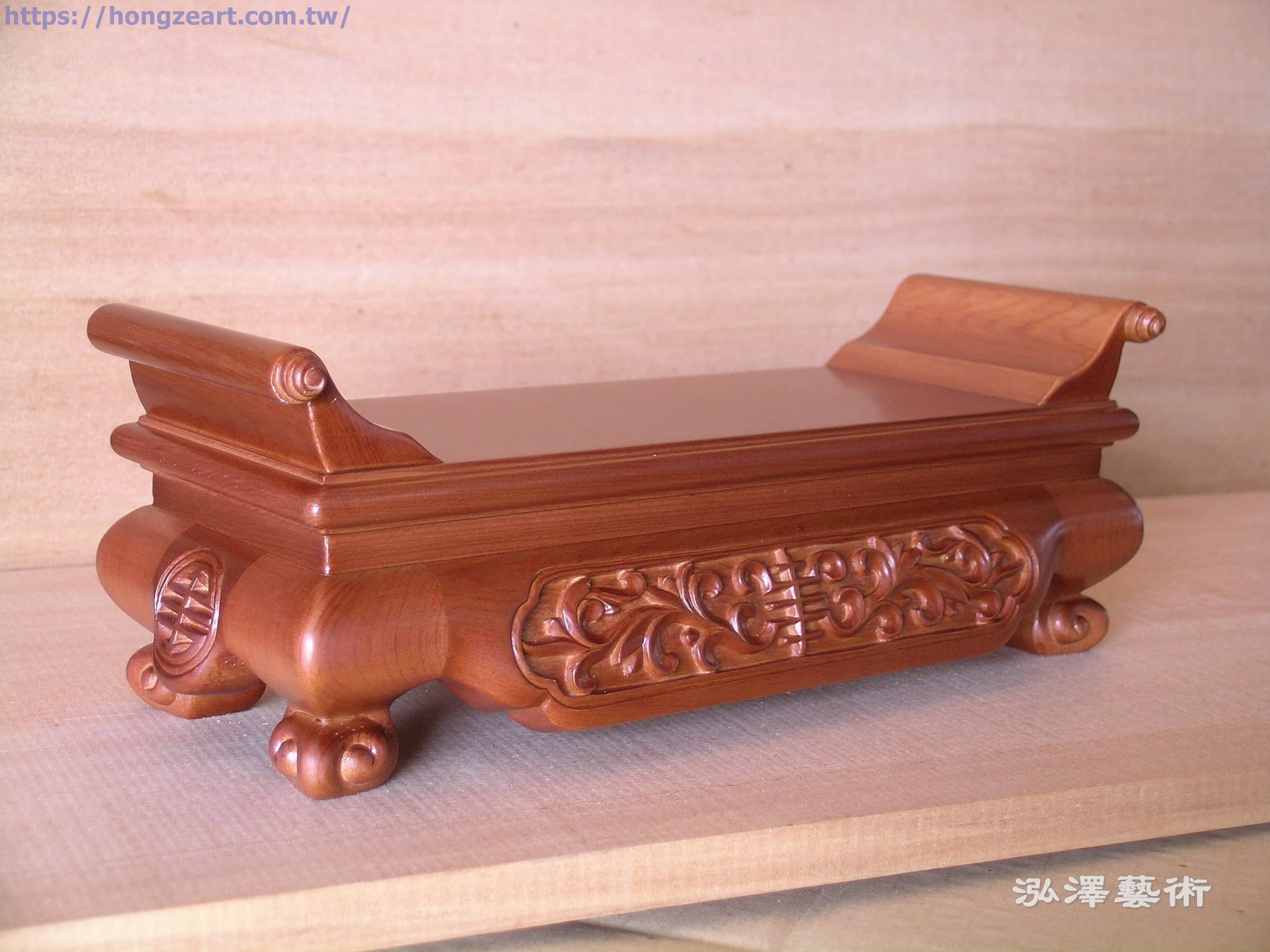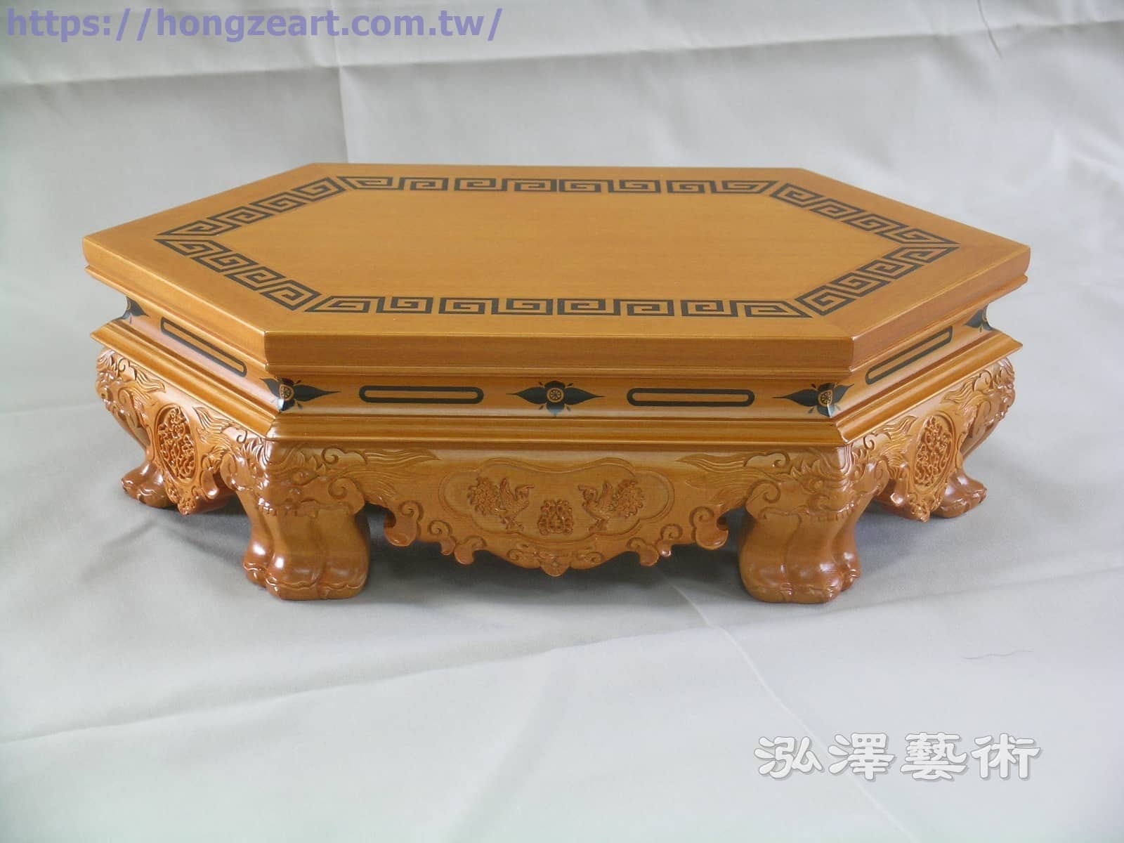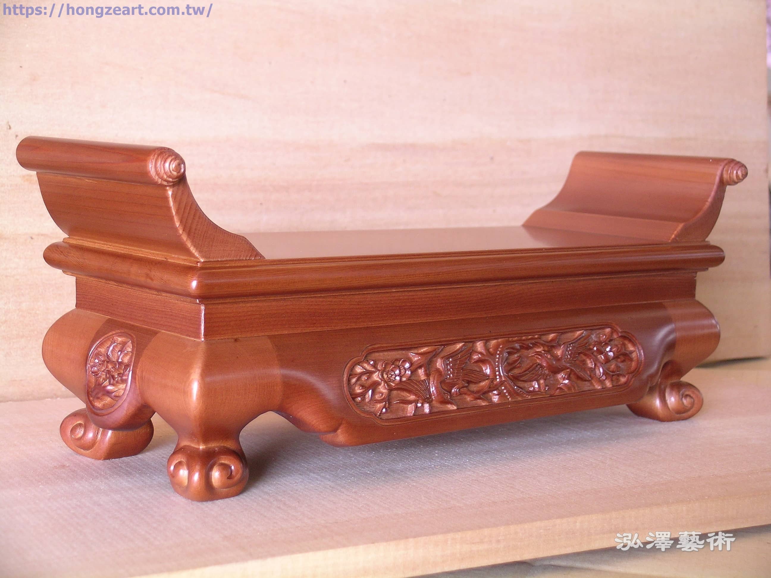 【簡述】 本台座勒水處以花鳥透雕,喜鵲棲息於梅花上,捎來喜訊,意喻「梅鵲報喜」。案面書卷形翹頭,期望子孫世世代代以書香傳家。本作品與一路連科祖先龕搭配成一體系,更添奉祀祖先之虔敬與莊嚴隆重氣氛。